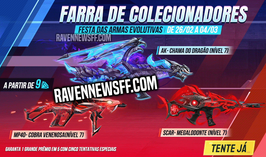 De acordo com o banner encontrado, o evento das armas evolutivas é o Farra de Colecionadores. Este evento conta com desconto em algumas edições, mas desta vez ele está a partir de 9 diamantes. Uma quantia considerável para tentar ganhar um item gastando pouco. Neste evento teremos a famosa MP40 – Cobra, AK – Chama do Dragão e SCAR – Megalodonte como itens principais do evento.