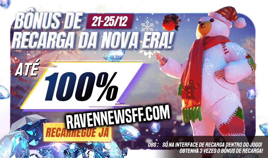 O novo bônus de 100% ficará disponível do dia 20 de dezembro ao dia 25. Em comemoração do evento “Nova Era“, evento natalino que trará muitos prêmios de graça e muitos eventos difíceis. Por isso, que está chegando o bônus para amenizar um pouco esses gastos. E uma novidade muito boa do novo bônus, é que podemos utilizá-lo 3 vezes. Supondo todos podem recarregar 3 vezes e mesmo assim, ganhar 100% nas 3 recargas. Aproveite para pegar o bônus junto com o novo evento de recarga que está chegando, teremos um novo amanhã dia 17 de dezembro, porém essa recarga não vai até o dia 21, portanto somente o próximo que ainda não foi divulgado, poderemos pegar junto com o novo bônus de 110%.