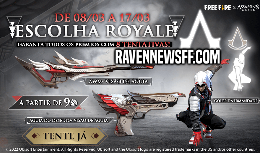 A nova parceria do Free Fire com o Assassin’s Creed parou tudo! Embora os eventos da parceria já estão chegando no servidor do Brasil. Os itens pagos estão chegando também. Portanto amanhã está chegando o novo Escolha Royale com itens exclusivos na roleta. Certamente os principais itens do evento são: